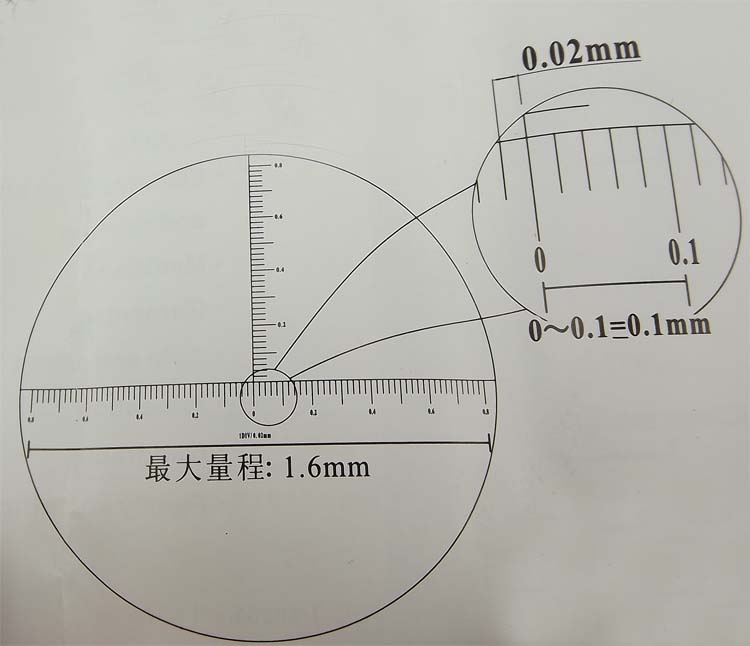- 3、本顯微鏡對(duì)準(zhǔn)觀察物在調(diào)焦清晰時(shí),顯微鏡刻度尺寸上的1小格等于實(shí)際尺寸0.02mm;0~0.2等于實(shí)際尺寸0.2mm,測(cè)量范圍0.02-1.6mm;Zui大量程:1.6mm