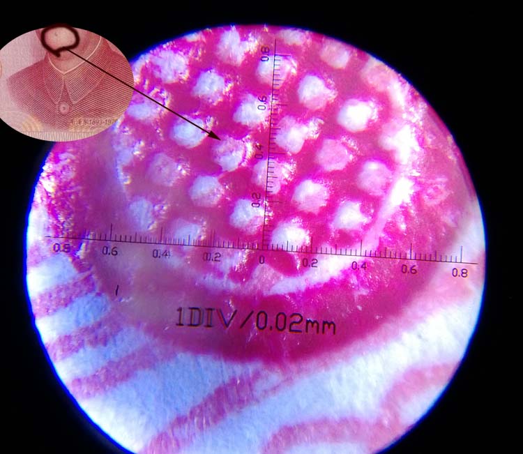 - 1.用于金融、財(cái)稅、集郵、電子行業(yè)觀察鈔票,票證、郵、幣、卡的紙質(zhì)和印刷網(wǎng)點(diǎn)??蓽?zhǔn)確迅速地識(shí)別假鈔,分辨率極高。紫光燈檢測(cè)不確切的,用該儀器能準(zhǔn)確鑒別,真人民幣在該顯微鏡下圖紋清晰、線條連貫,假鈔圖紋多由點(diǎn)狀組成、線條呈點(diǎn)狀不連貫、色澤淺、模糊、無立體感。
