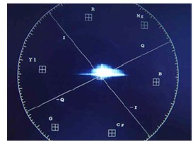 屏幕有個圓形,里面有一些小框和線條,這個圓形對應的就是大家熟悉的色輪。色輪的中心是純白,越往邊緣色彩飽和度越高,直至到達最大飽和度。如果把一個畫面?zhèn)魉徒o矢量示波器,矢量示波器就會把畫面的色彩信息對應標示在屏幕上。比如,我們要測量一臺顯微鏡相機拍出來的紅色是否是真正的紅色,就讓相機拍攝一個“標準紅色”,然后把畫面?zhèn)魉徒o矢量示波器,如果測量結果標示在紅色的位置,那么就說明這臺攝像機對紅色的表現(xiàn)是準確的,如果不在紅色位置,則是偏色,往左偏就是偏黃,往右偏就是偏品(洋紅)。