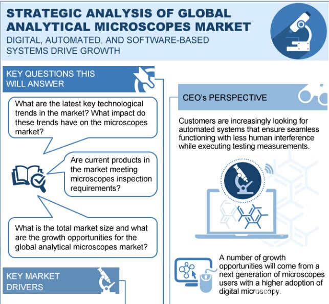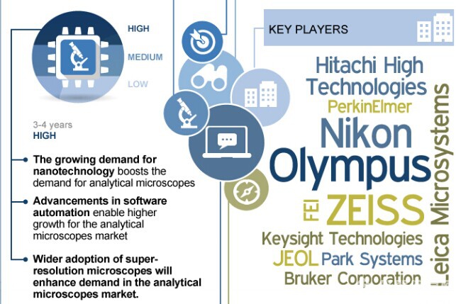 Frost & Sullivan最近提供了一份全球分析顯微鏡市場(chǎng)的詳細(xì)報(bào)告。報(bào)告研究分析了顯微鏡的關(guān)鍵技術(shù)及其市場(chǎng)的影響趨勢(shì)。在這份研究中,F(xiàn)rost & Sullivan的分析師將市場(chǎng)分為以下細(xì)分市場(chǎng):掃描探針顯微鏡電子顯微鏡、光學(xué)顯微鏡;應(yīng)用領(lǐng)域包括:生命科學(xué)、材料科學(xué)、納米技術(shù)。