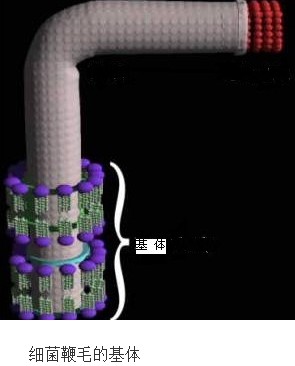 鞭毛的旋轉速度是非??斓?,每秒鐘旋轉兩百到一千多轉,比一般的電動機要快得多,鞭毛的高速旋轉是由其附著于菌體上的基體旋轉帶動的,基體實際上就是鞭毛的基部,它由一個中軸套上兩個或四個環(huán)構成,鑲嵌固定在細菌的體表中,在科學家的眼中,基體簡直就是一臺精巧的納米機械—分子馬達,但這個馬達并不是靠電流驅動,而是用伴隨著細胞膜兩側質子梯度的消失產生的生物能量來驅動,鞭毛馬達還可以轉向從而使菌體發(fā)生翻滾進而改變細菌的運動方向,事實上細菌在游動時也并不是單純地一直朝前游,而是伴隨著不時的隨機翻滾轉向,但從表觀上看仍表現(xiàn)為細菌的前行。